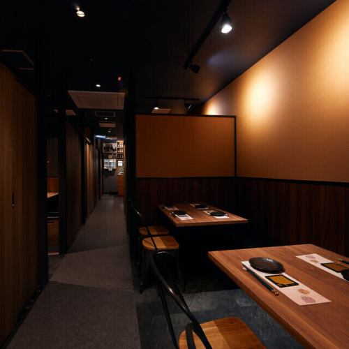 【落ち着いた大人の雰囲気】照明を抑えた間接照明と和モダンなインテリアが特徴。デートや会食など、静かに食事を楽しみたい方にぴったり。上質な空間でA5和牛と旬の味覚を味わえば、日常を忘れる至福のひと時をお過ごしいただけます。